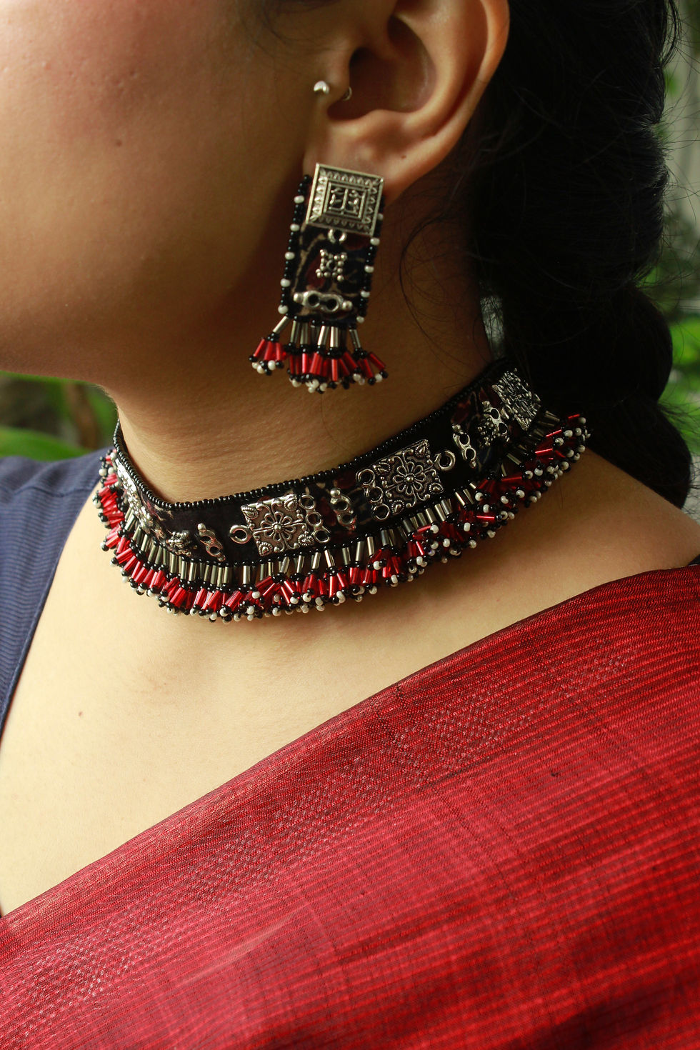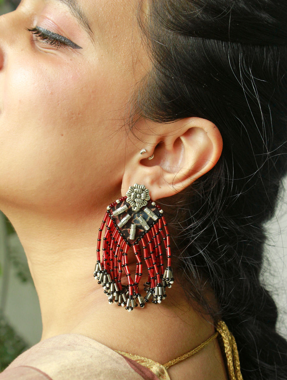 Just like twinkling stars in the night sky, pipe glass beads decorate this collection. The subtle sheen of metal motifs, hand sewn on top, is reminiscent of the countless asterisms coexisting in the universe. The collection is handmade in signature Ajrakh printed fabric.