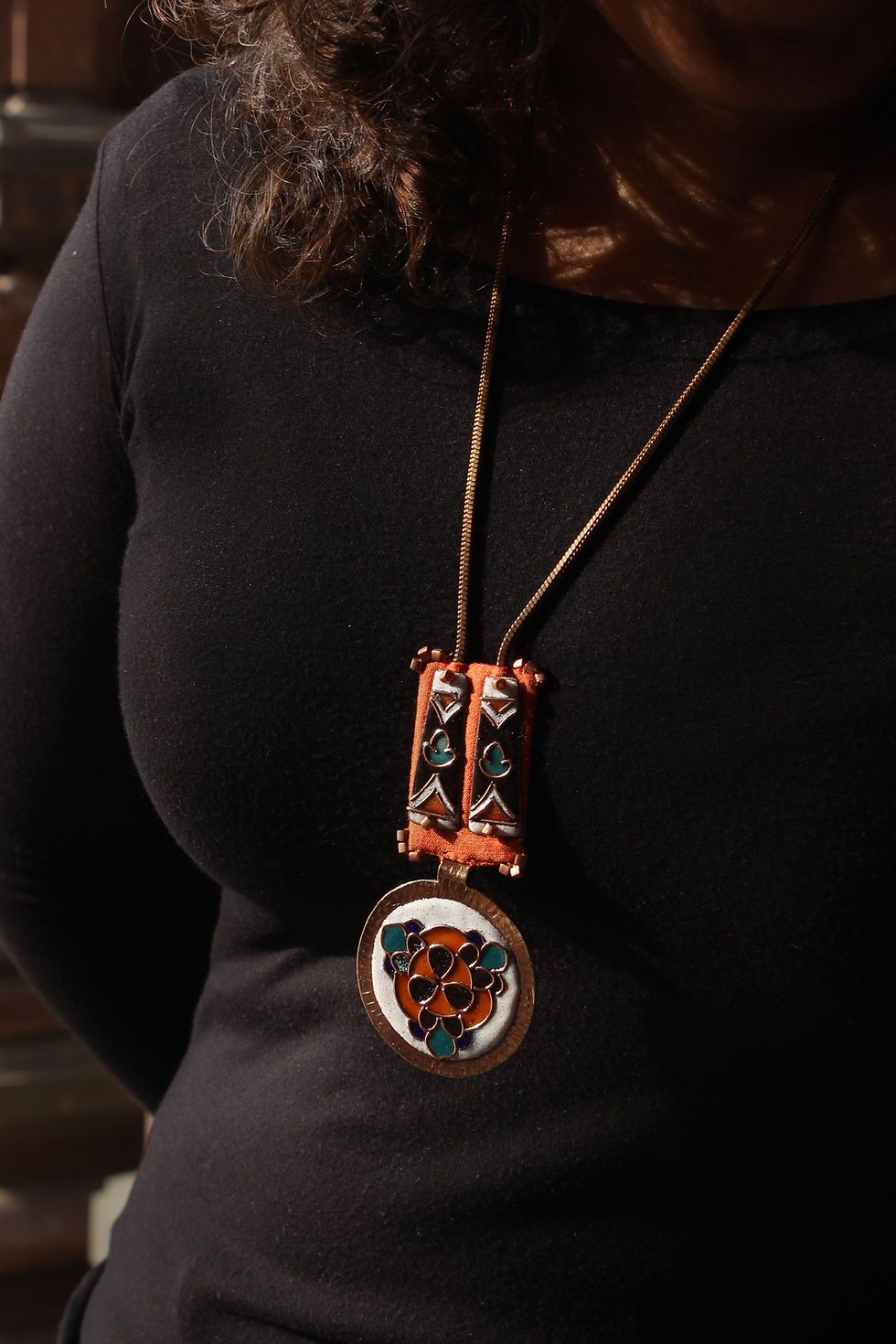 The collection brings you contemporary jewellery pieces incorporating intricately hand enameled copper elements with stones and glass beads. Every piece is assembled together by skilled craftsmen using techniques like handstitching & bead-work with signature fabric as the base.